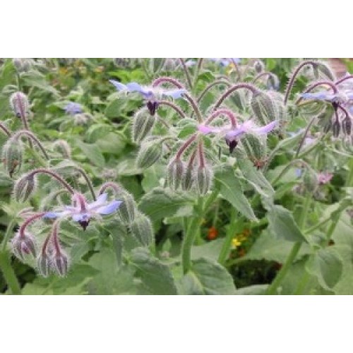 Annual. Borago Officinale. Blue edible flowers. Attracts bees. Easy to grow, self-seeds.