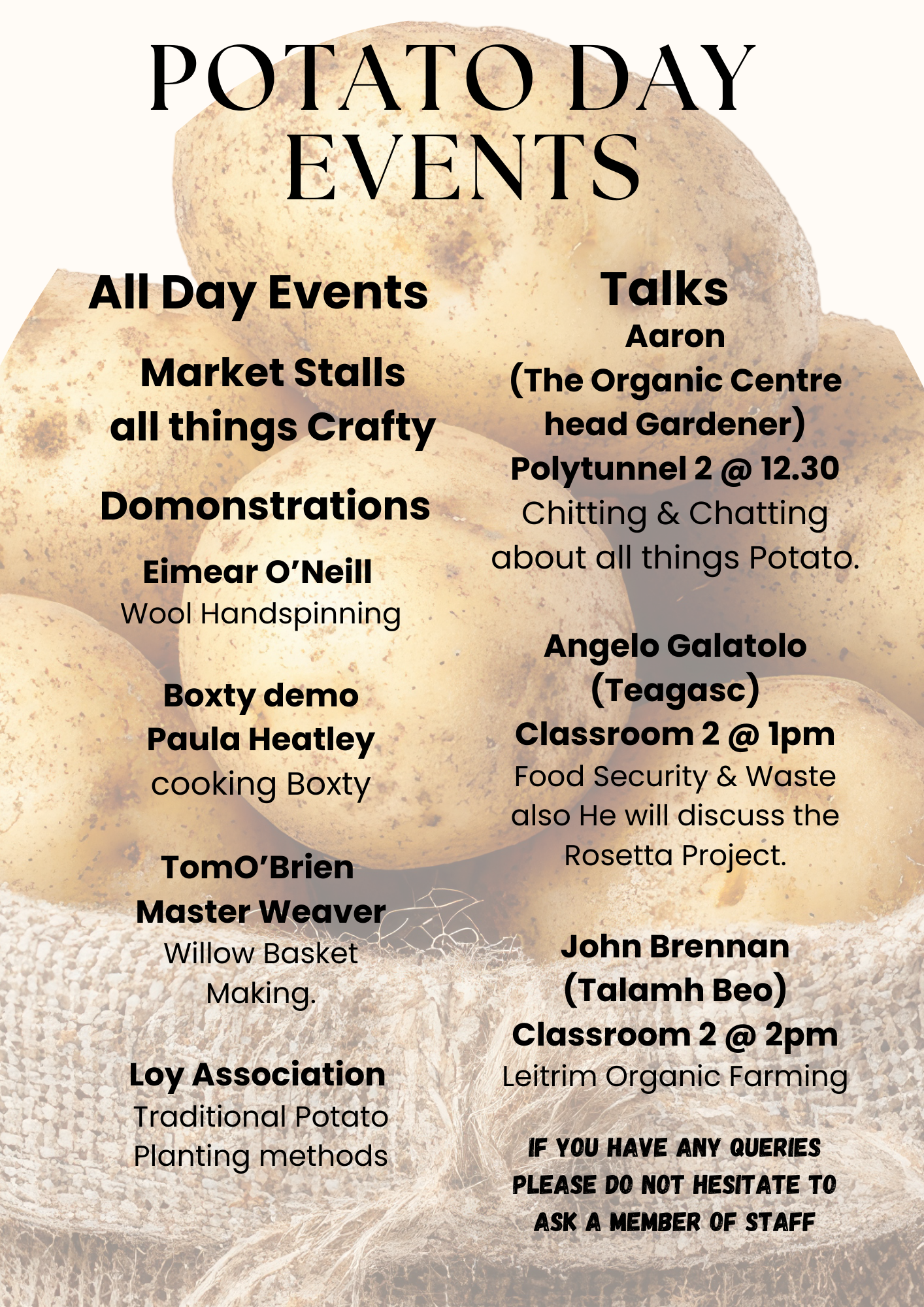 Join the Organic Centre for its annual Potato Day on Sunday March 1st, 2026 from 12-4pm. Browse the bustling craft and food market, with local artisan produce. Get planting with the large national supply & variation of quality seed potatoes to choose from. Grab Sunday lunch, with all things potato on the menu of the Grass Roof Cafe. Be inspired with potato themed talks, tours & demonstration’s. See how past generations planted with the 'Loy association of Ireland'.